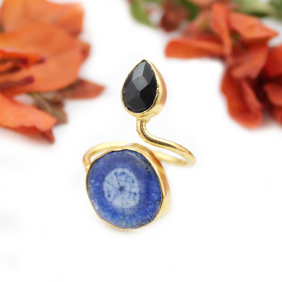 24K Gold Plated Natural Black Onyx Solar Quartz Pink Double Stone Pear Shape Designer Womens Ring Beautiful Indian Fashion Rings
