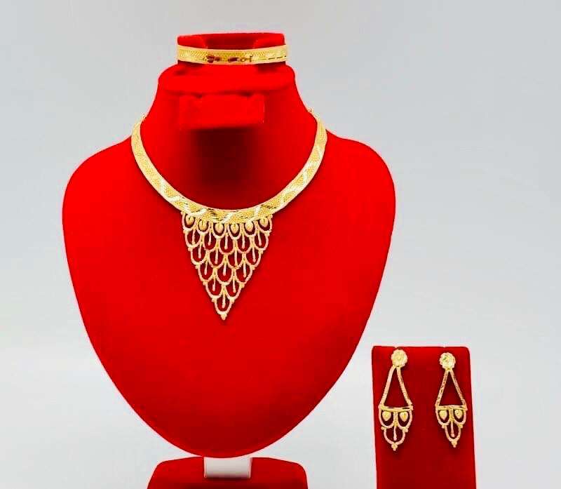 24K Gold Plated Vintage Fashion Jewelry Set Includes Copper Necklace Earrings Bangles Brooches Designed USA Germany France