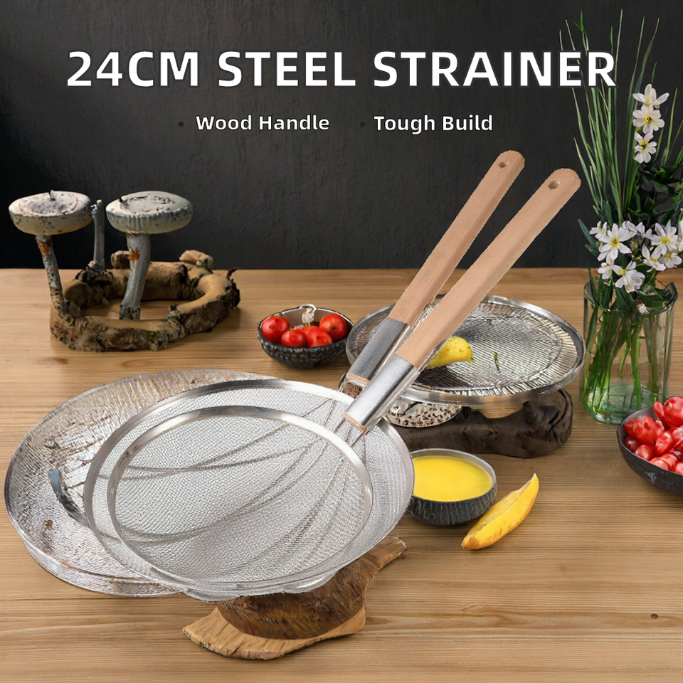 24cm Wooden Handle Stainless Steel Eco-Friendly Freezer Safe Flour Sifter Sieve Oil Strainer Small Hole Food Strainer Colander
