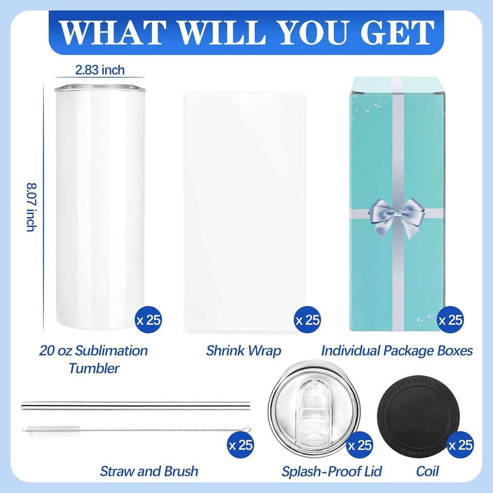 25 Pack Sublimation Tumblers 20 oz Bulk Blank Skinny Straight Flat Edge Cups White Lid Straw Heat 800ml-900ml Capacity