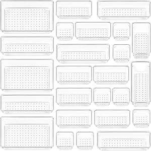 DreamCraft 25-Piece Clear Plastic Drawer Organizer Set Versatile PP Storage Trays Home Vanity Bathroom Makeup Utensils 4 Sizes