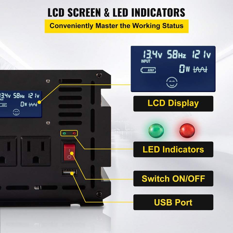 2500W Modified Sine Wave Power Inverter DC 12V AC 120V Converter LCD Display Remote Controller LED Indicator for Truck Boat