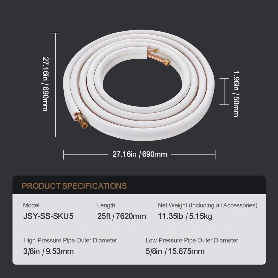 25FT Mini Split Line Set 3/8" 5/8" O.D Copper Pipes Tubing Triple-Layer Insulation for Air Conditioning Mini Split AC
