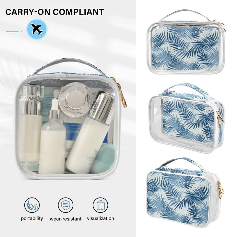 2PCS Blue Leaves Design Portable PVC Clear See Through Custom Small Beauty Cosmetic Pouch Organizer Makeup Case with Logo