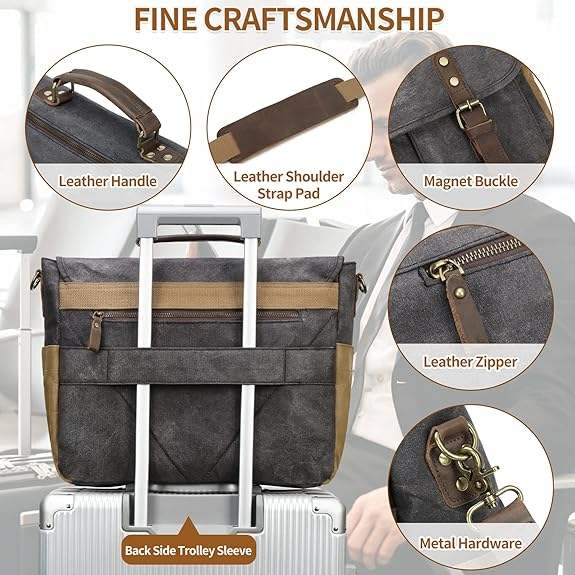 2PCS Mens Messenger Bag 15.6 Inch Genuine Leather Waxed Canvas Computer Laptop Bag Briefcase Satchel Shoulder Bag