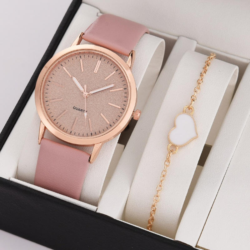 2pcs Women's Quartz Watches Heart Bracelet Set New Simple Casual Leather Strap Retro Women's Analog Wristwatch Bracelet Gift