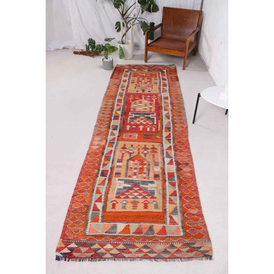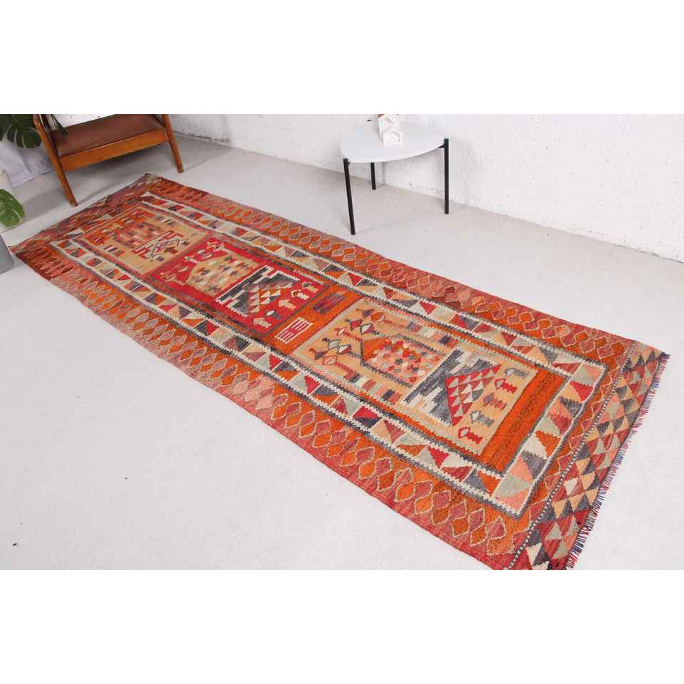 3.2x9.5 ft Turkish Rug, Kilim Rug, Red Camouflage Rug Wool