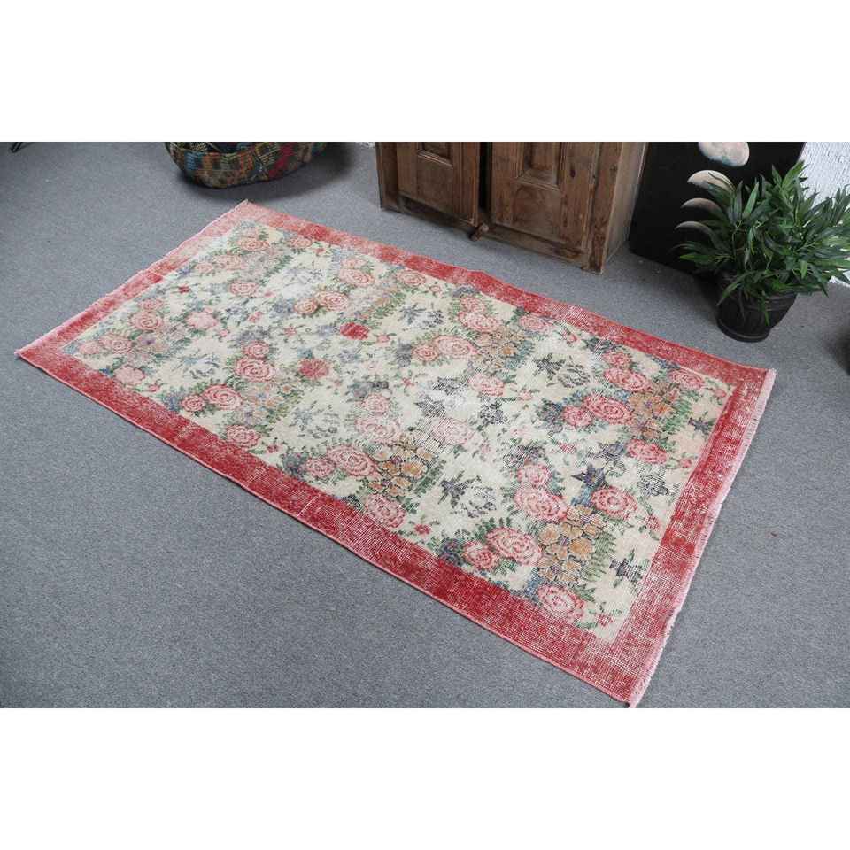 3.3x6.3 ft Rug, Turkish Vintage Rug, Red Floral Wool Rug