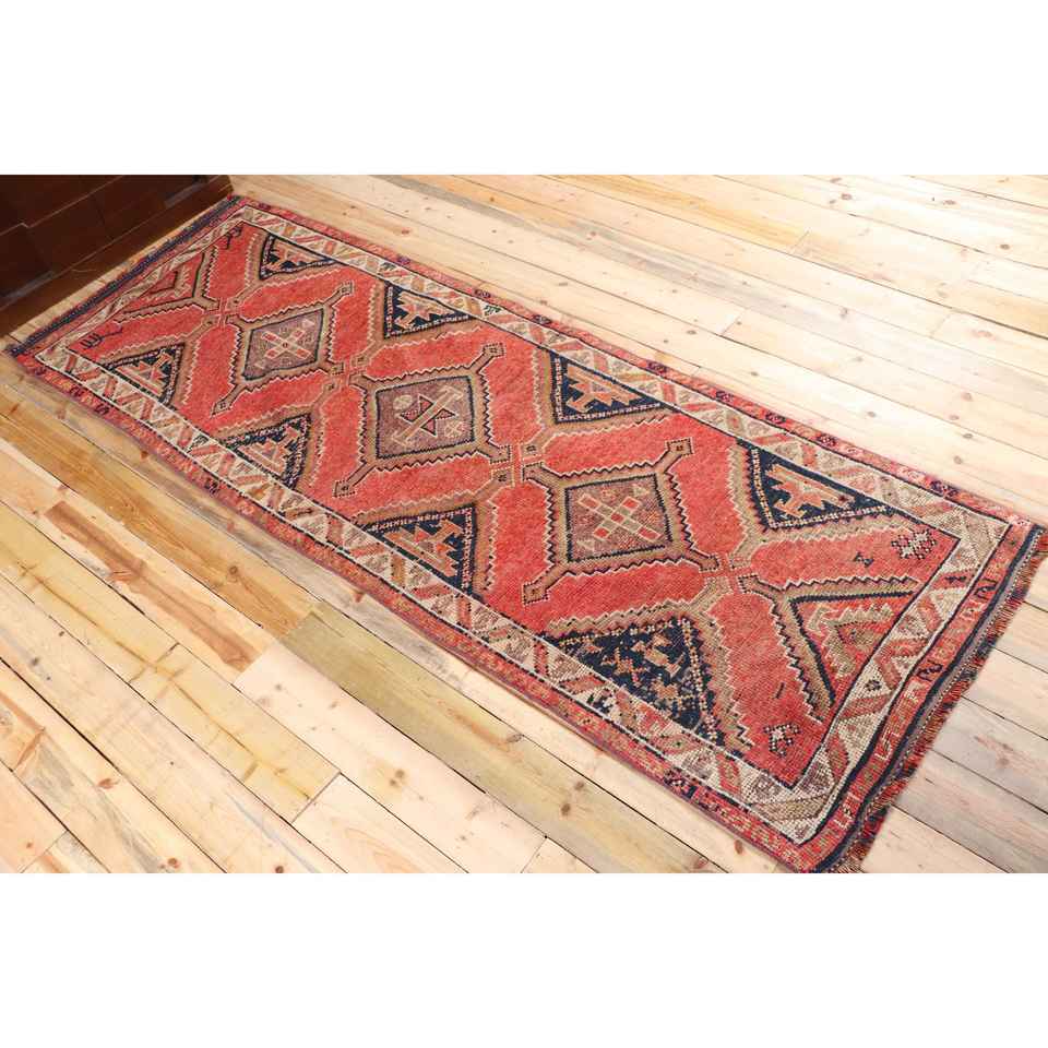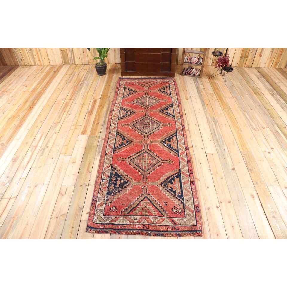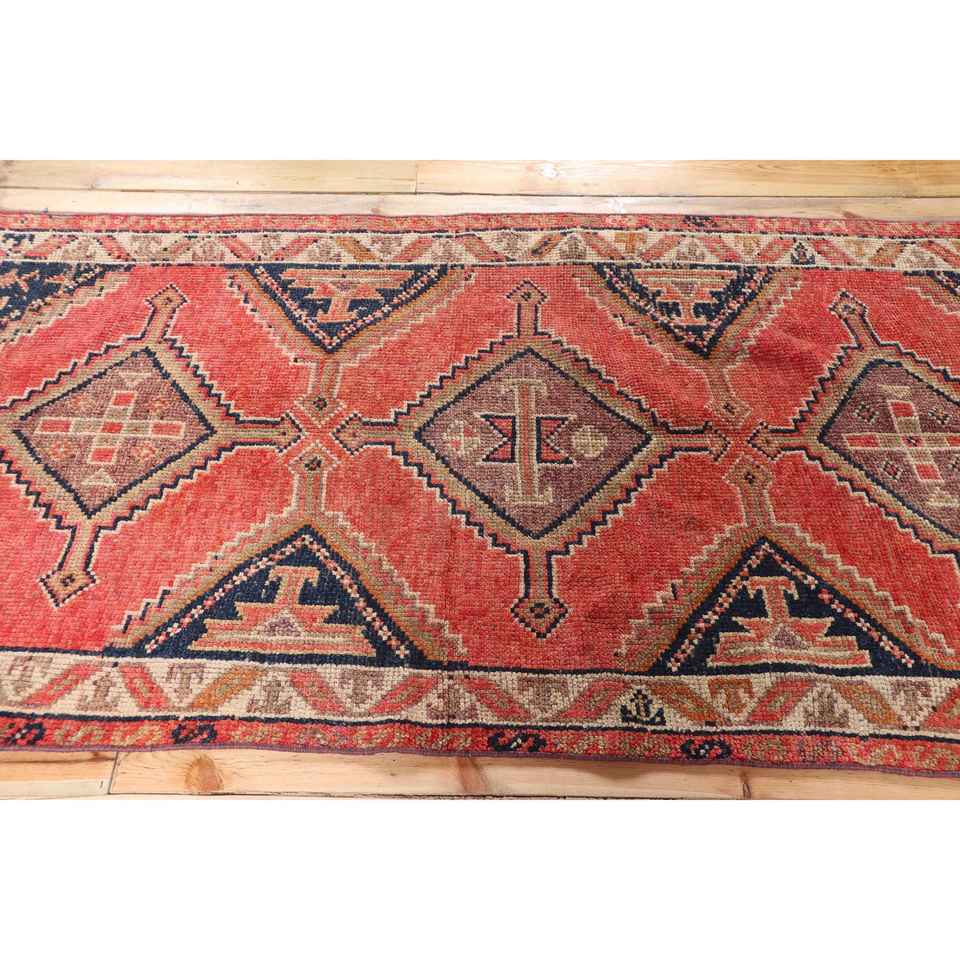 3.3x9.4 ft Rug, Turkish Vintage Rug, Red Blue Abstract Wool Rug