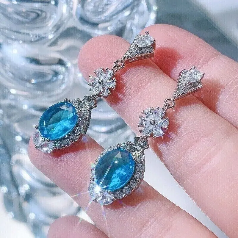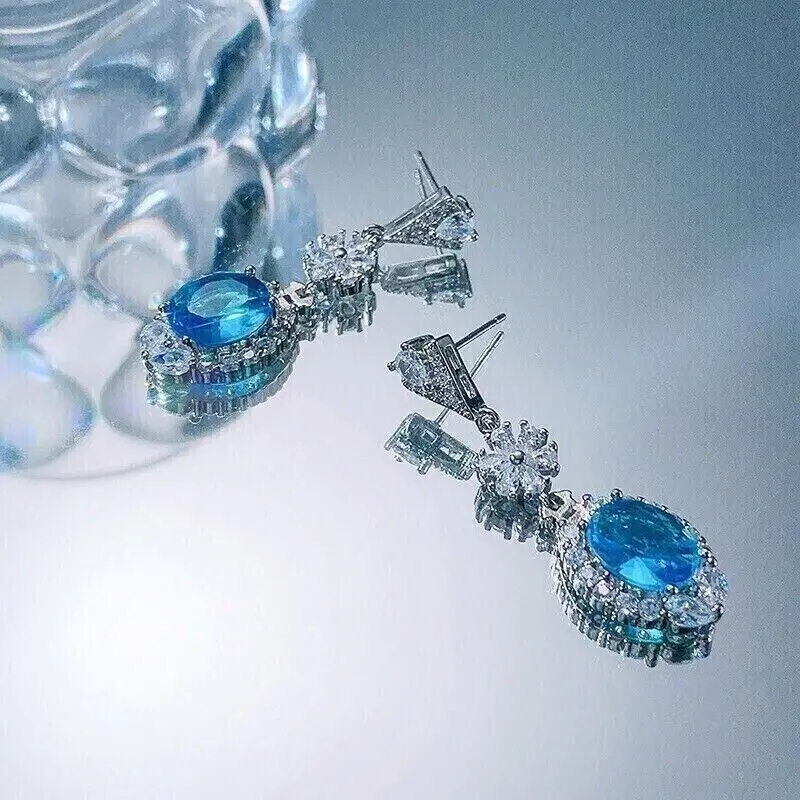 Vintage Style 925 Silver Drop/Dangle Earrings 3.40 Ct Oval Cut Moissanite Aquamarine