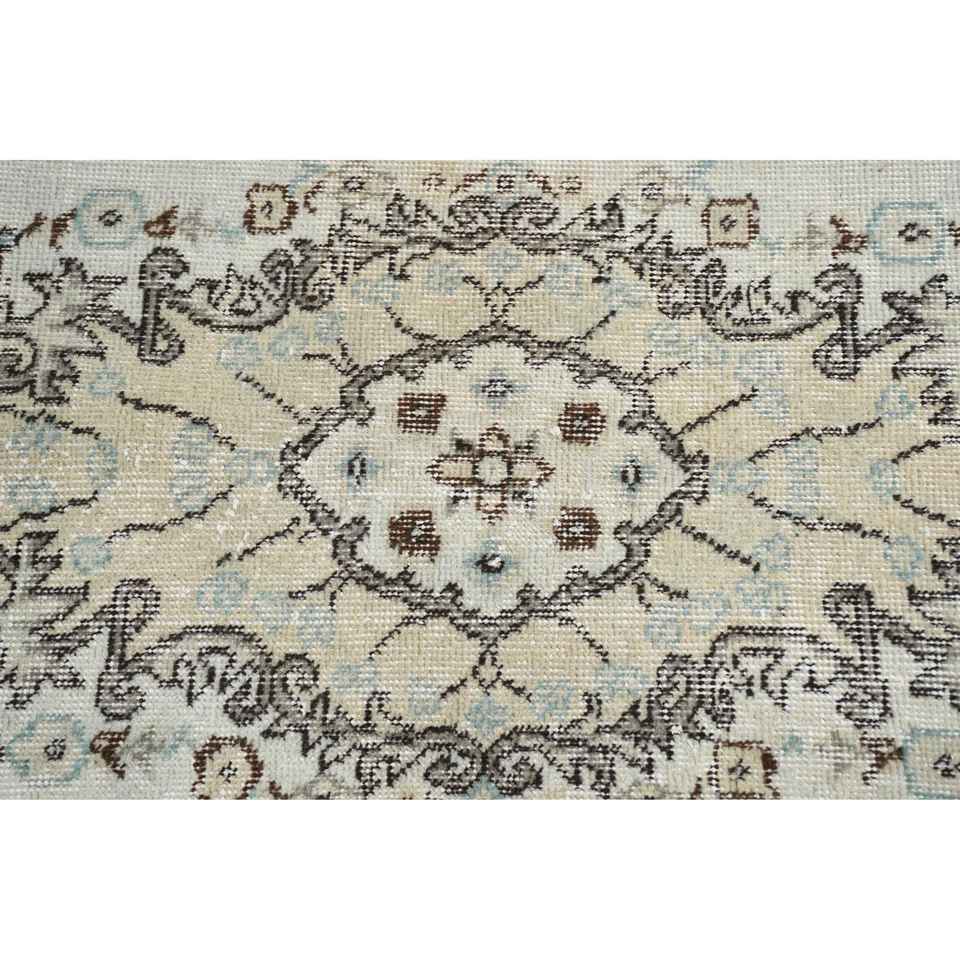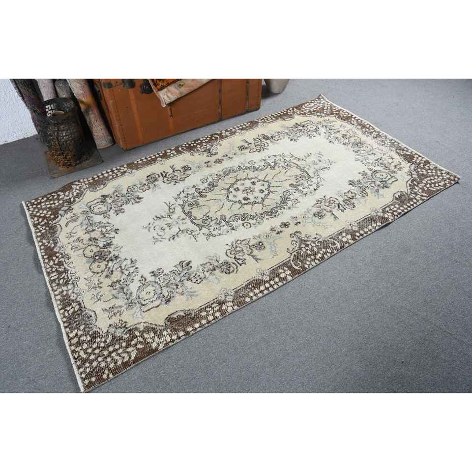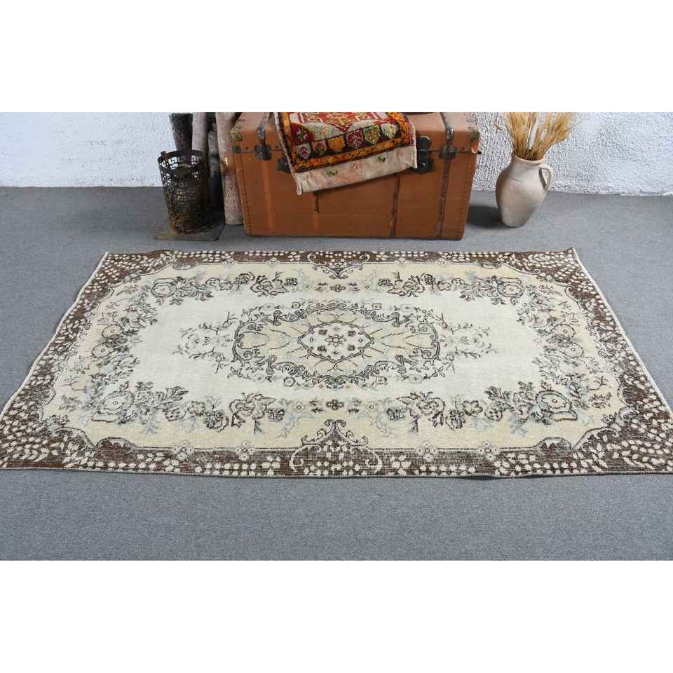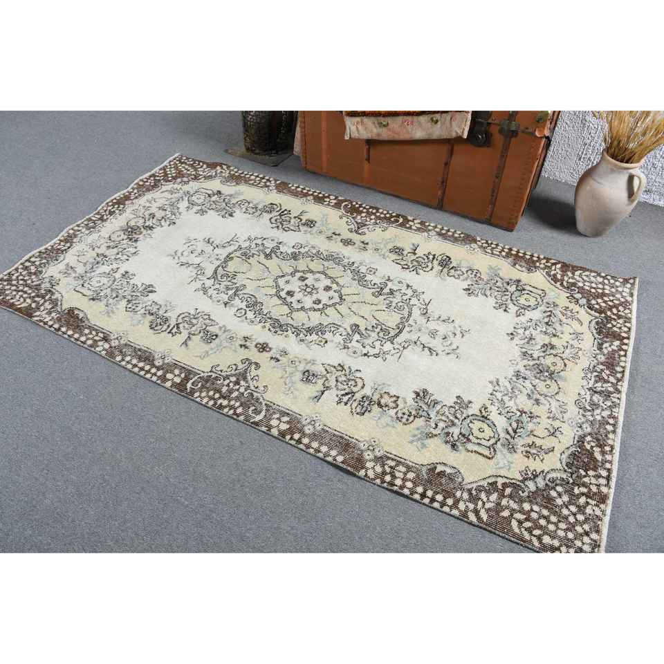 3.7x6.8 ft Rug, Turkish Vintage Rug, Brown White Abstract Wool Rug