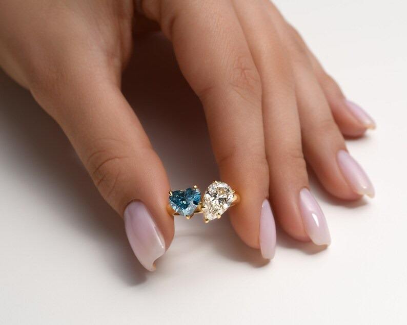 3 Carat Heart and pear Lab Grown Diamond Wedding Ring 14K White Gold Fancy Blue and F Color VVS2 Clarity toi et moi ring
