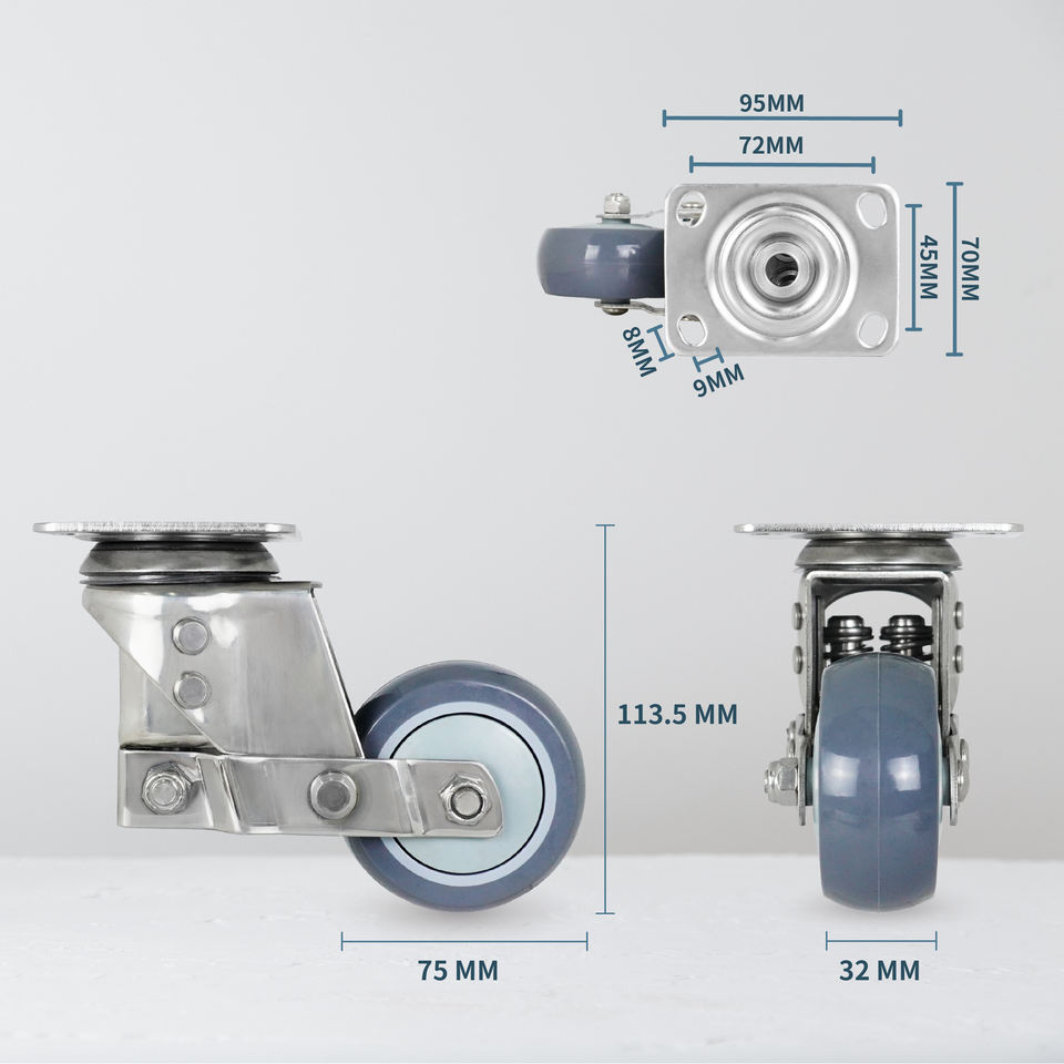 3 Inch 304 Stainless Steel Shock Absorbing Swivel PU Caster Wheel with Top Plate for Medical and Equipment Trolley