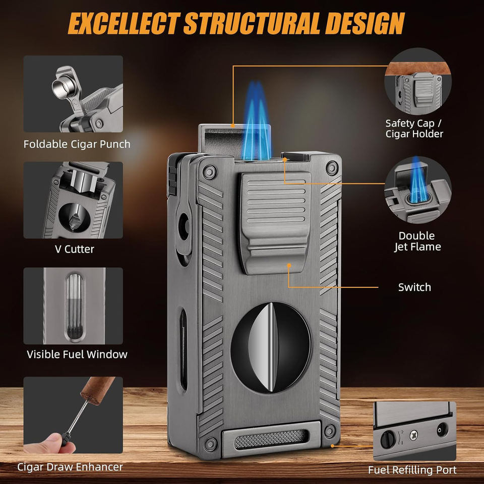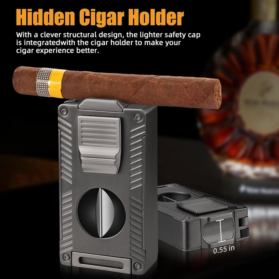 3 Jets Flame Cigar Lighter Multi-Function with V-Shaped Cutter Cigar Punch Portable Windproof Refillable Lighter for Gift