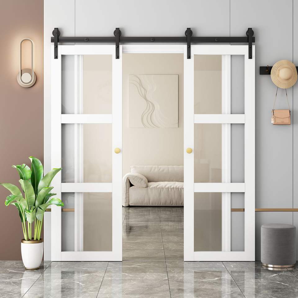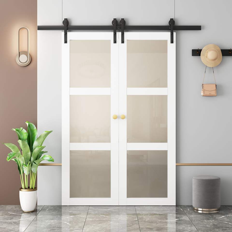 3-Lite Frosted Glass French Door Solid Wood Manufacture Interior Double Bathroom Door With Hardware Kit