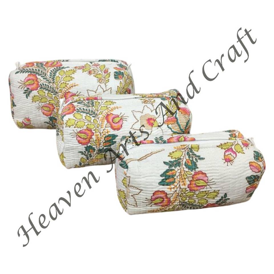 3-Pcs Quilted Bohemian Block Print Cotton Cosmetic Bags Cases Zipper Quilted Leather Tote Bag Set for Toiletries Cosmetics