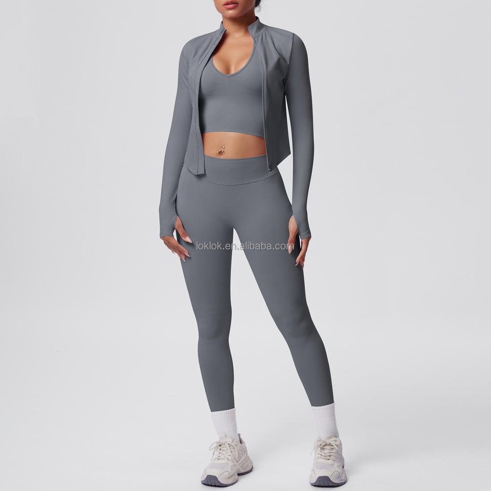 3-Piece Jacket Top Pants Exercise Wear Custom Logo Female Yoga Apparel Set Solid High Elastic Soft Fabric Breathable Eco-yes
