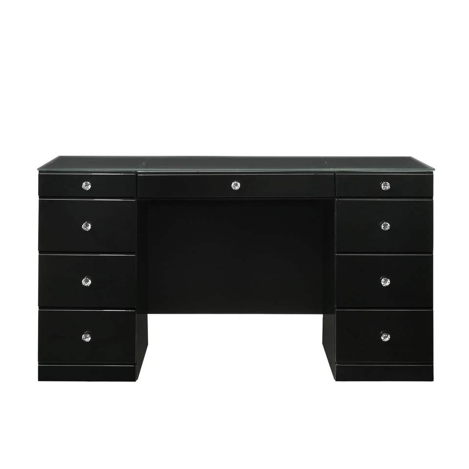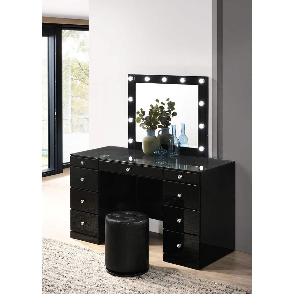 3-Piece LED Lighted Mirror Glass Top 9 Drawers Round Stool Wooden Bedroom Furniture Black Crystal Knobs Makeup Vanity Set