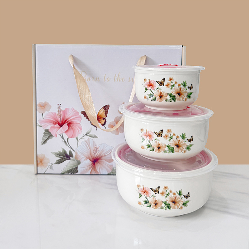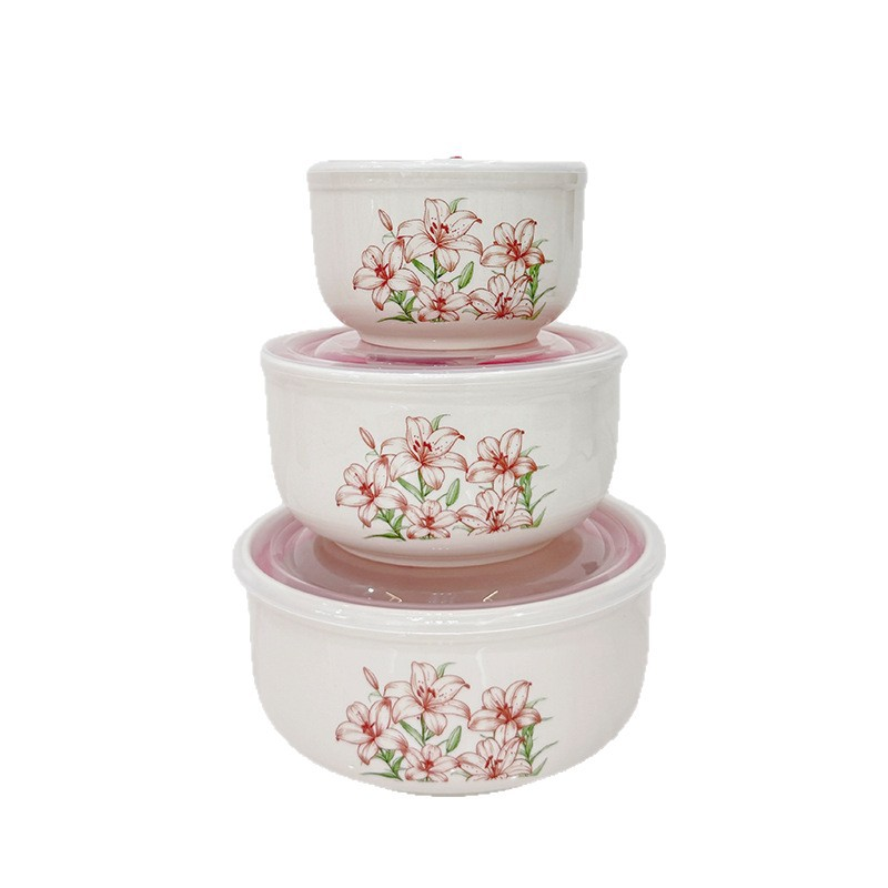 3 Piece Microwave Dishwasher Safe Kitchen Serving Floral Design Euro Porcelain Ceramic Nesting Storage Bowl Set with Lids
