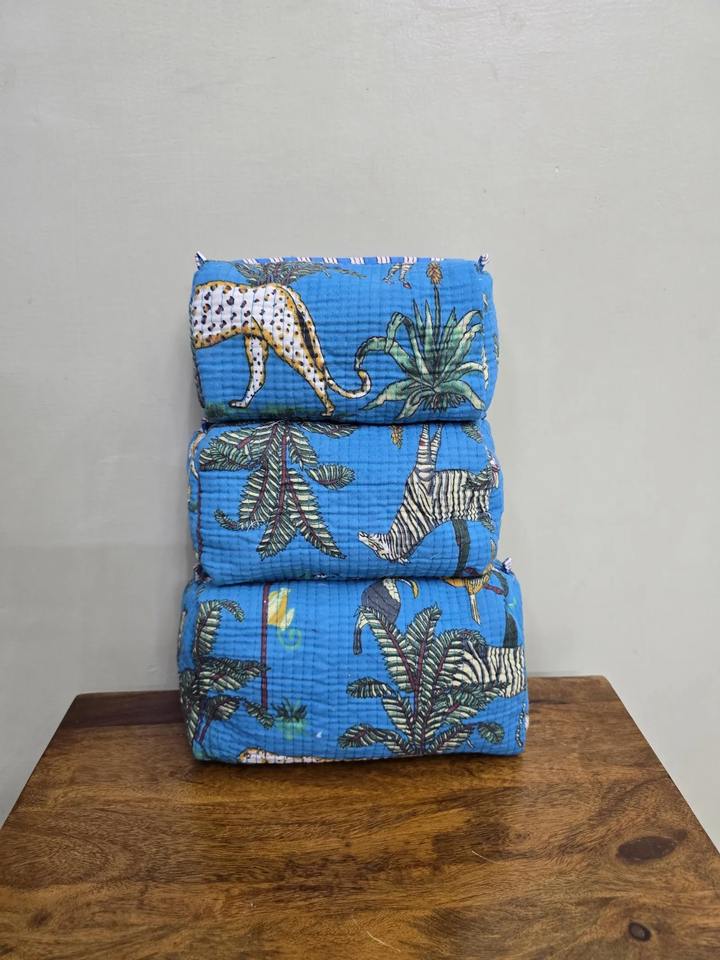 3 Piece Quilted Eco-Friendly Cotton Case Zipper Closure Block Print Design Large Vintage Water Resistant Durable Makeup Bag