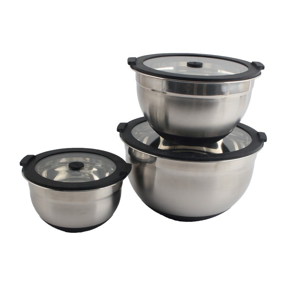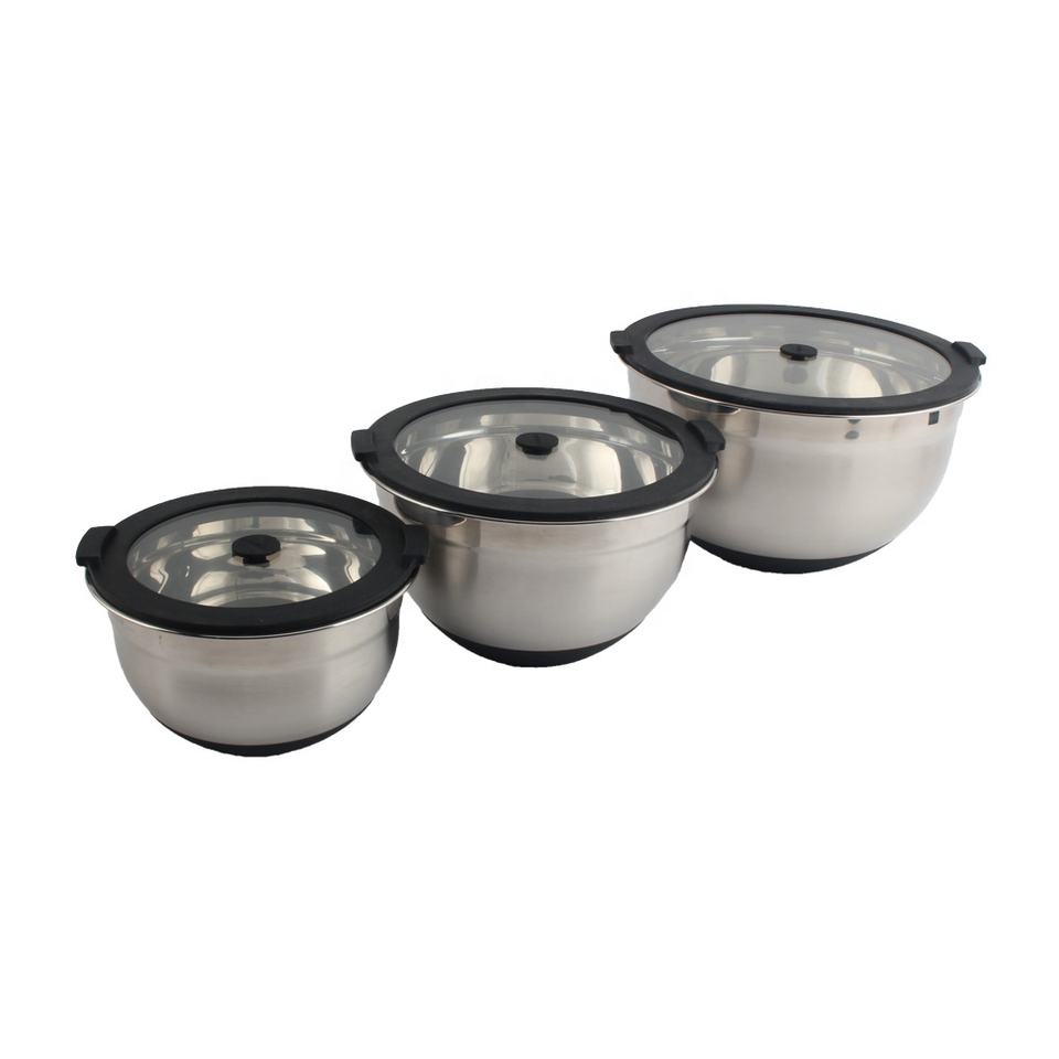 3-Piece with Vacuum Seal Lids and Non-Slip Base, Stainless Steel Mixing Bowl Set