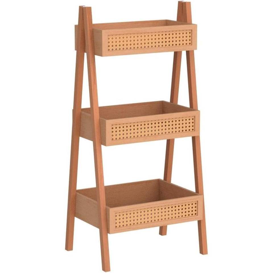 3-Tier Free Standing Rattan Bookshelf with Ladder Wood Organizer Storage Shelves for Living Room Dining Bookcase Blanket Stand