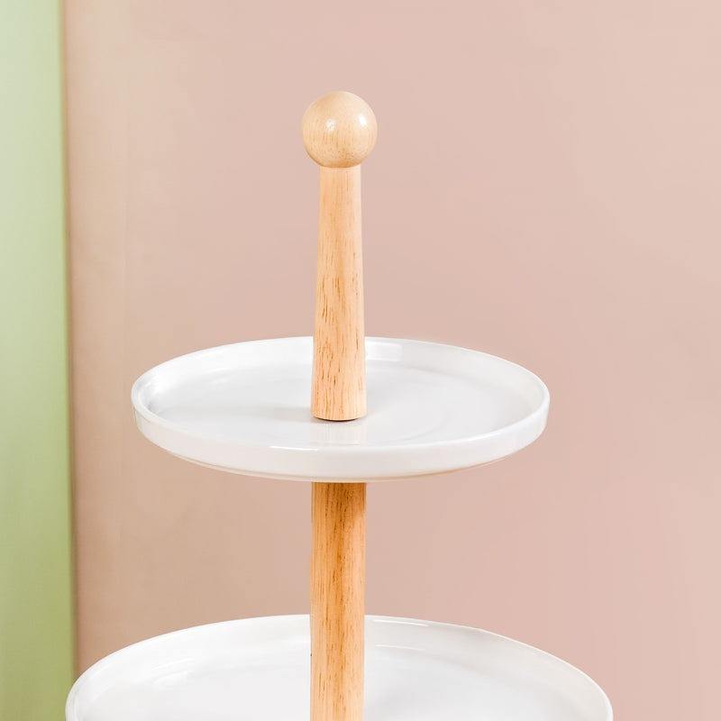 3 Tier White Ceramic Cake Stand With Wooden Pillar Round Porcelain Dessert Display Tray Tiered Serving Platter for Tea Party