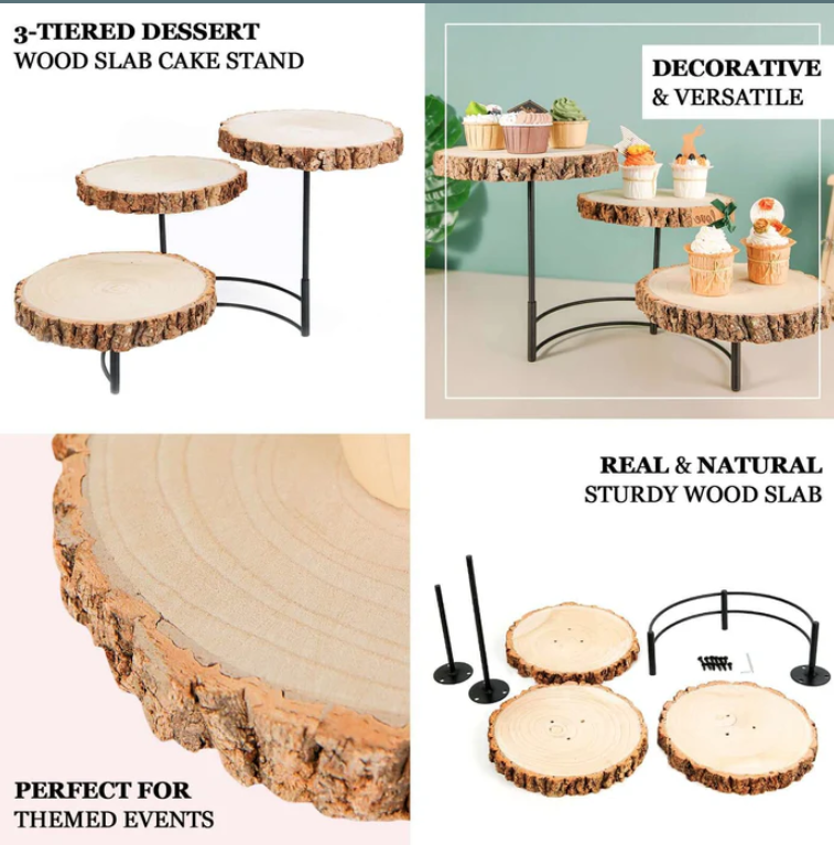 3-Tier Wooden Cheese Board Stand Tower Design Natural Wood Slice Rustic Cupcake Centerpiece with Assembly Tools