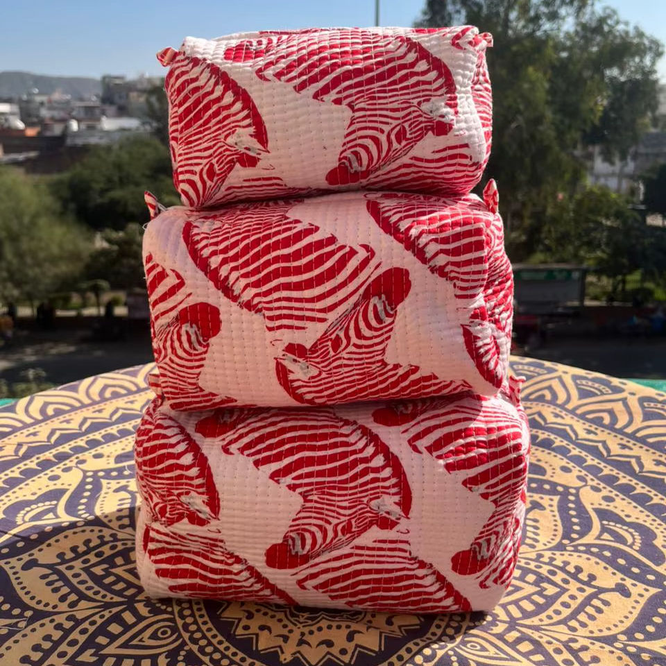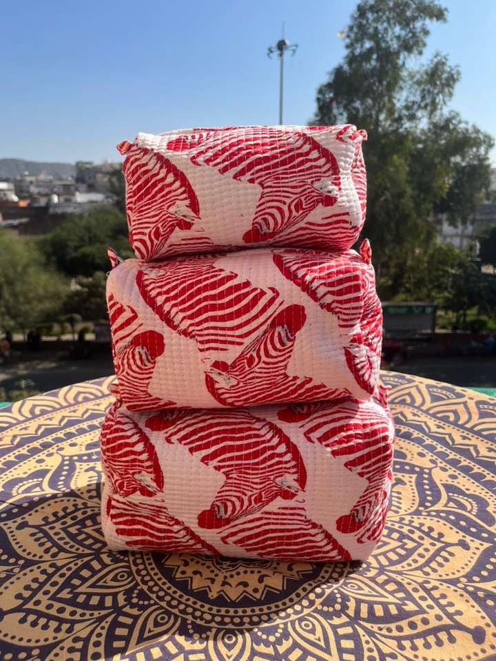 3 Toiletry Bags Set Of Indian Quilted Cotton Red Zebra Striped Print Zipper Block Fashion Bag Set Tassel Wholesale Rate