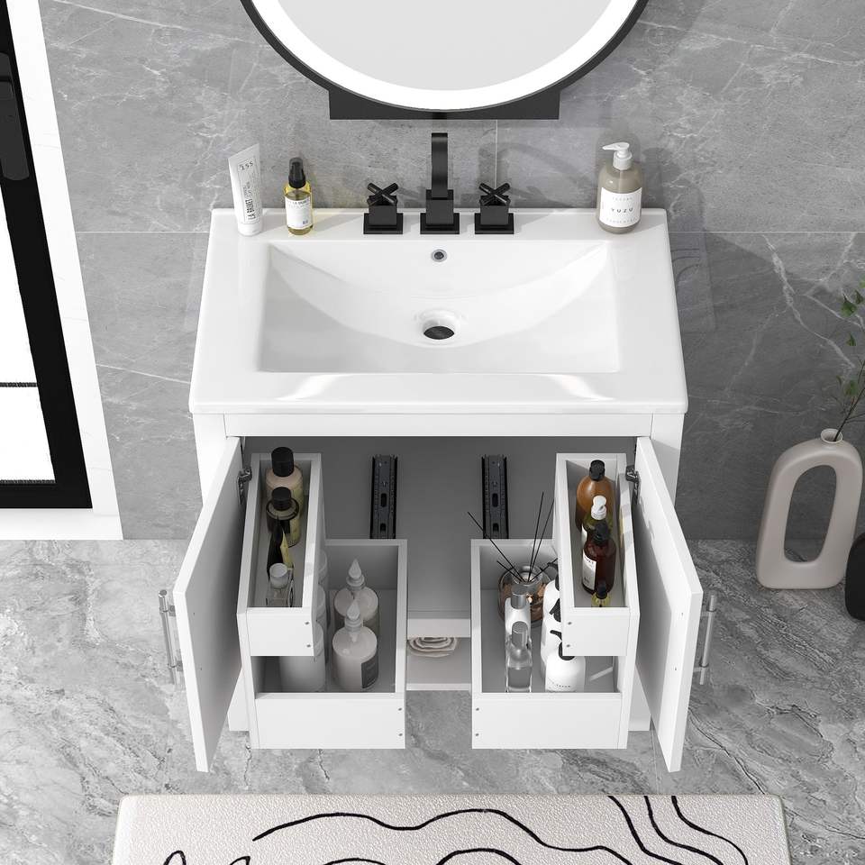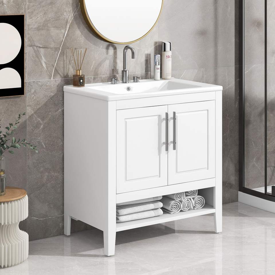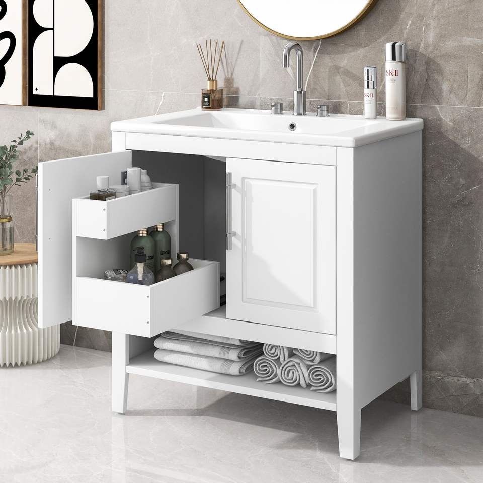 30-Inch White Solid Frame MDF Board Bathroom Vanity with Sink Multi-Functional Cabinet Featuring Doors and Drawers