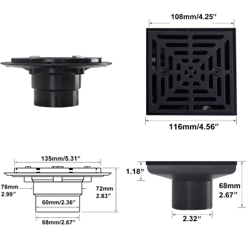 304 Square Stainless Steel Matt Black with Drain Flange Base Shower Floor Drain