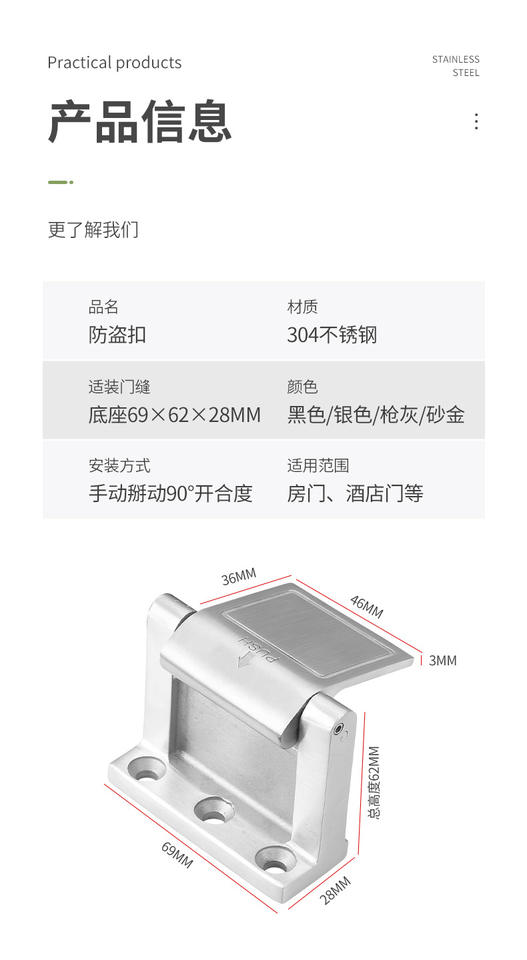 304 Stainless Steel Anti-Theft Hook Indoor Door Latch for Bathroom and Hotel Room Reverse Locking Plug Door Lock Durable