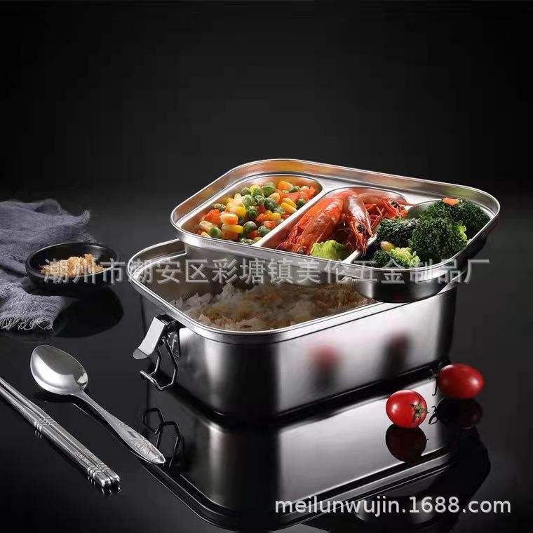 304 Stainless Steel Lunch Box Rectangle Double Layer Leak Proof With Handle And Buckle For Office School Use