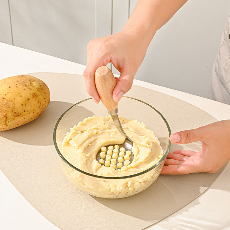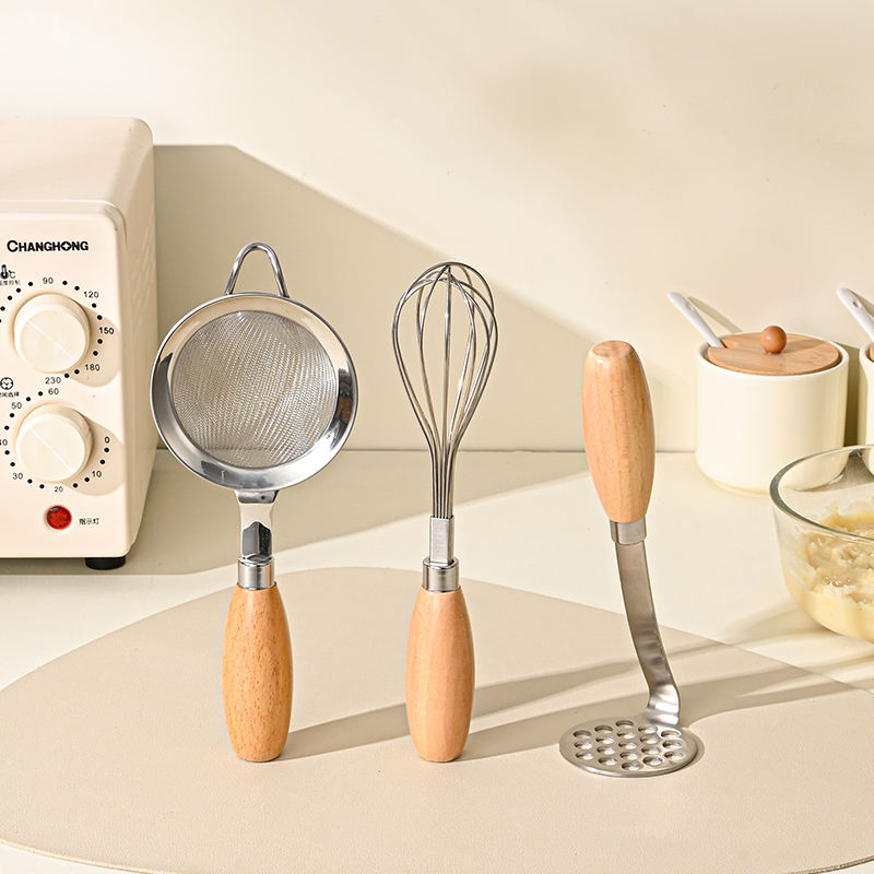 model number:Wooden-handled potato masher, egg beater, colander