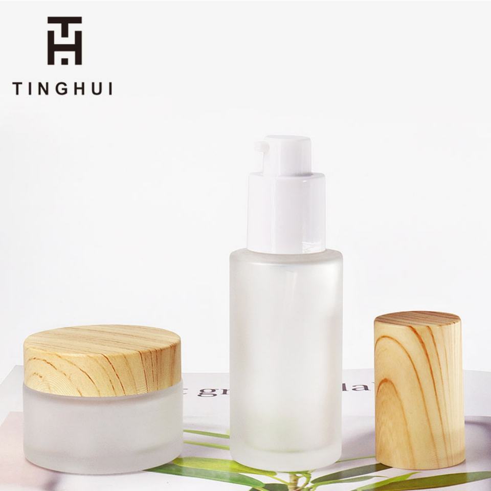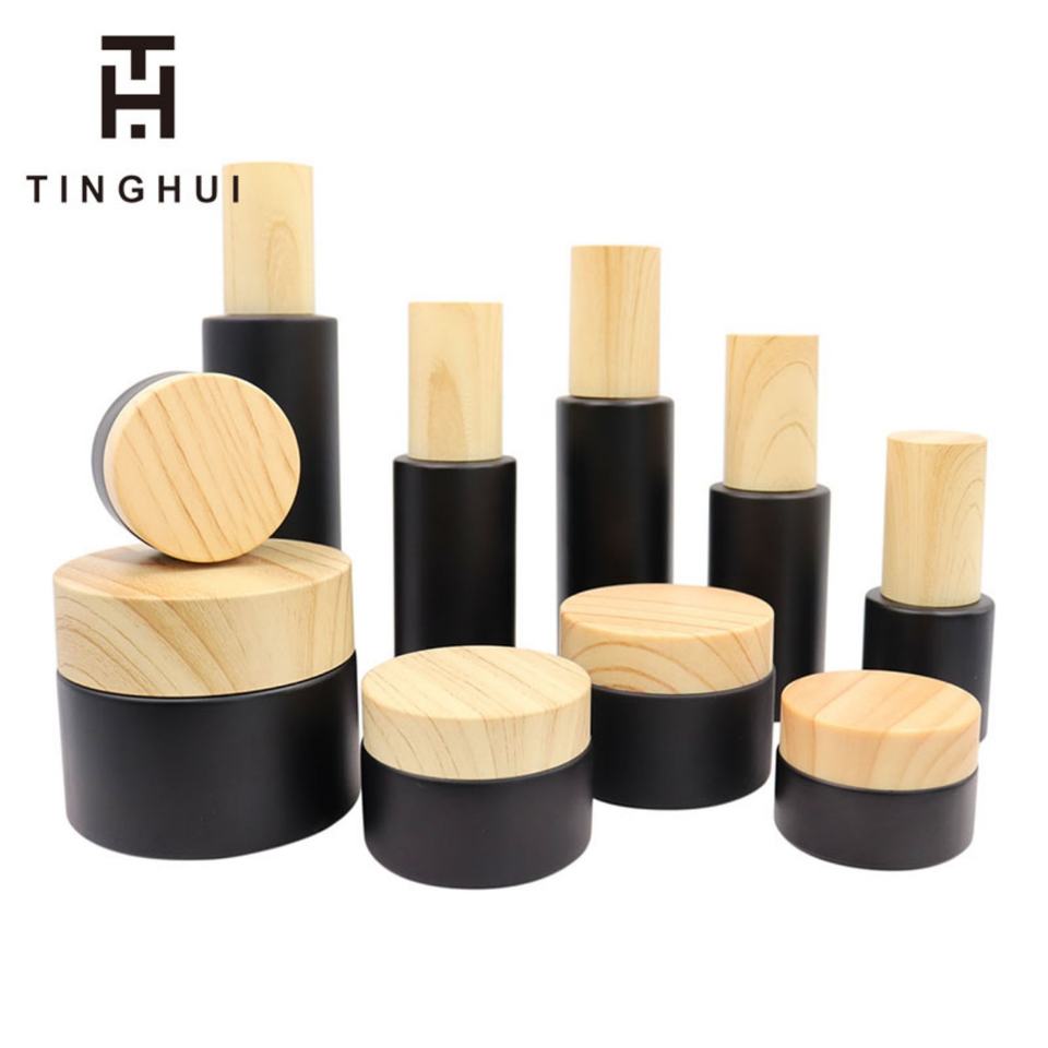 30ml/50ml/80ml/10g/20g/30g Empty Bottle Matte Surface with Wood Grain Lid Glass Cosmetics Bottle for Travel