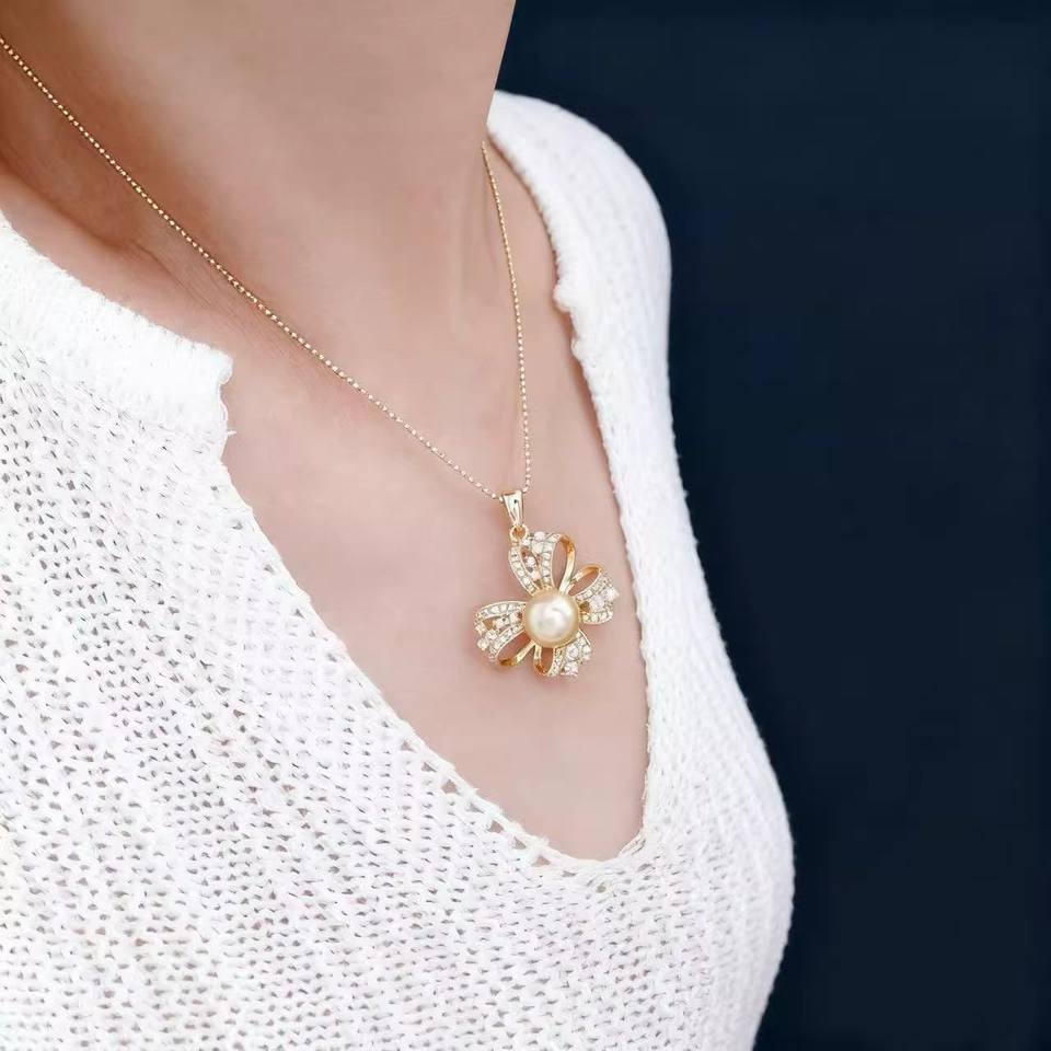 31427 DIY Pearl Accessories S925 Silver Pendant with 8-9mm Round & Cute Bow 8-9mm Round Empty Stand Necklace Pendant