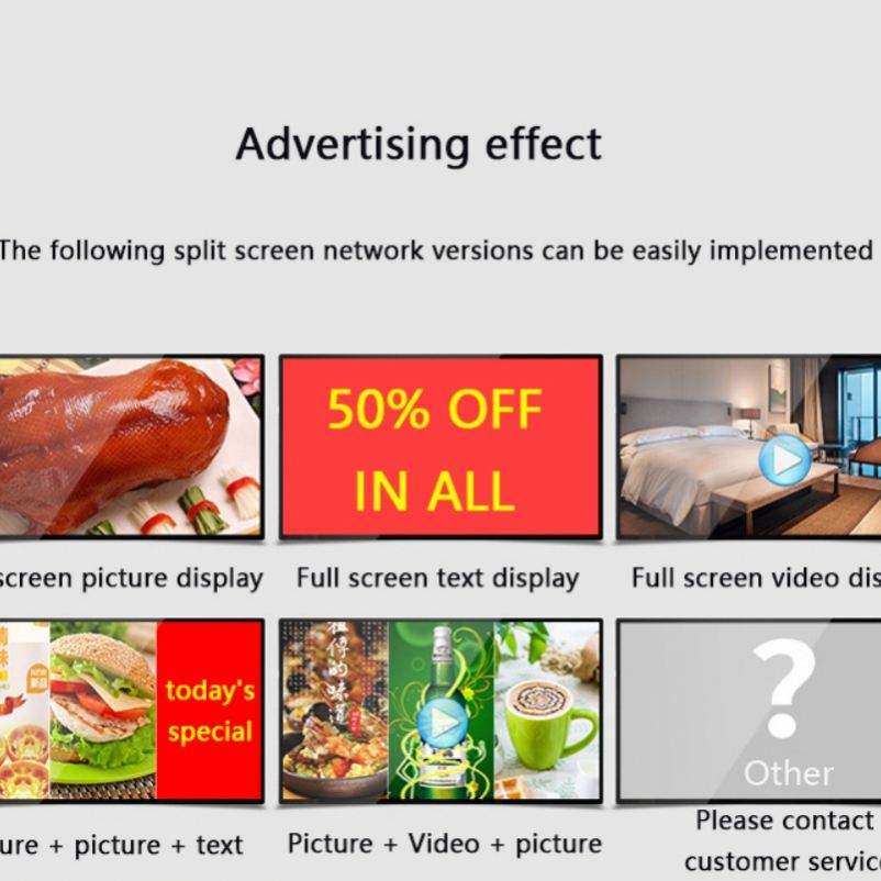 use:Advertising Publish, Retail Store, Shopping Mall, Display Of Dishes, Welcome Display, Self-Service Business, Exhibition Hall, Wayfinding, Airport, Subway, Elevator, Restaurant & Hotel Supplies, Education, Medical Treatment