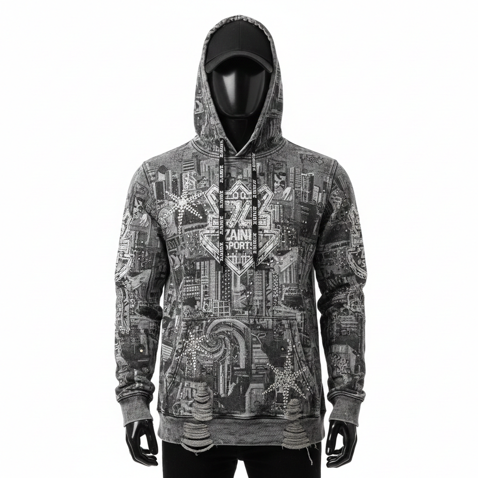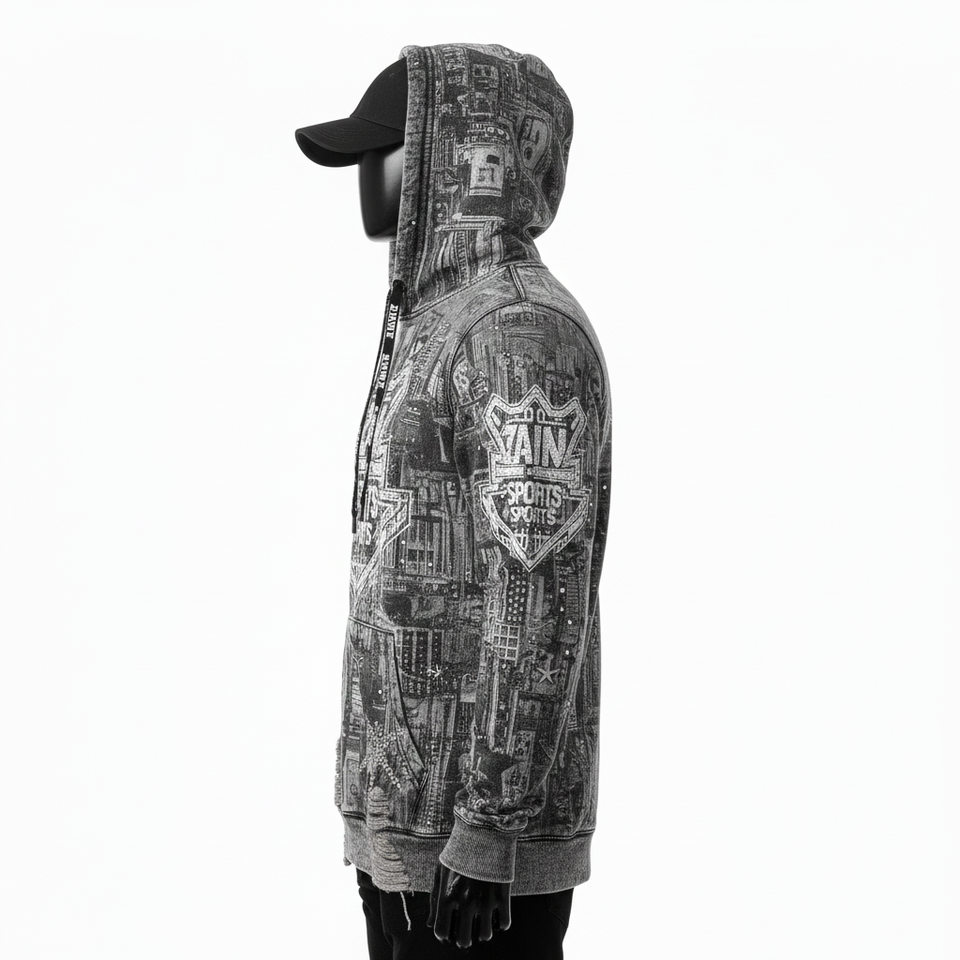 330GSM Premium Fleece Fabric City Print Panel Design Custom Logo Screen Print and Rhinestone basics Hoodie