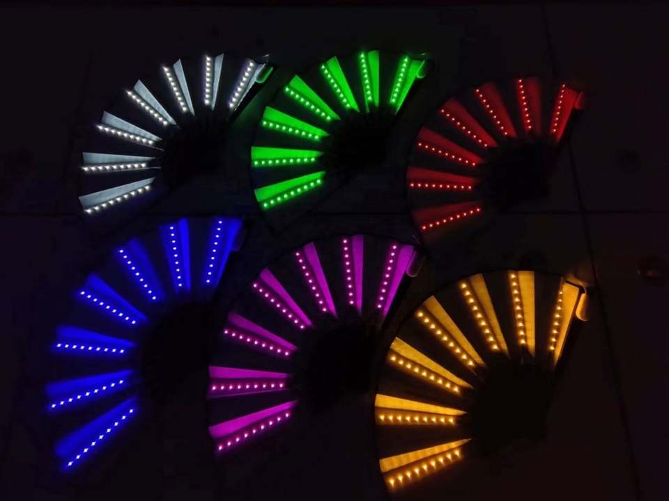 33cm LED Large Rave Folding Hand Fans with Bamboo Ribs and White or Black Fabric Battery Included