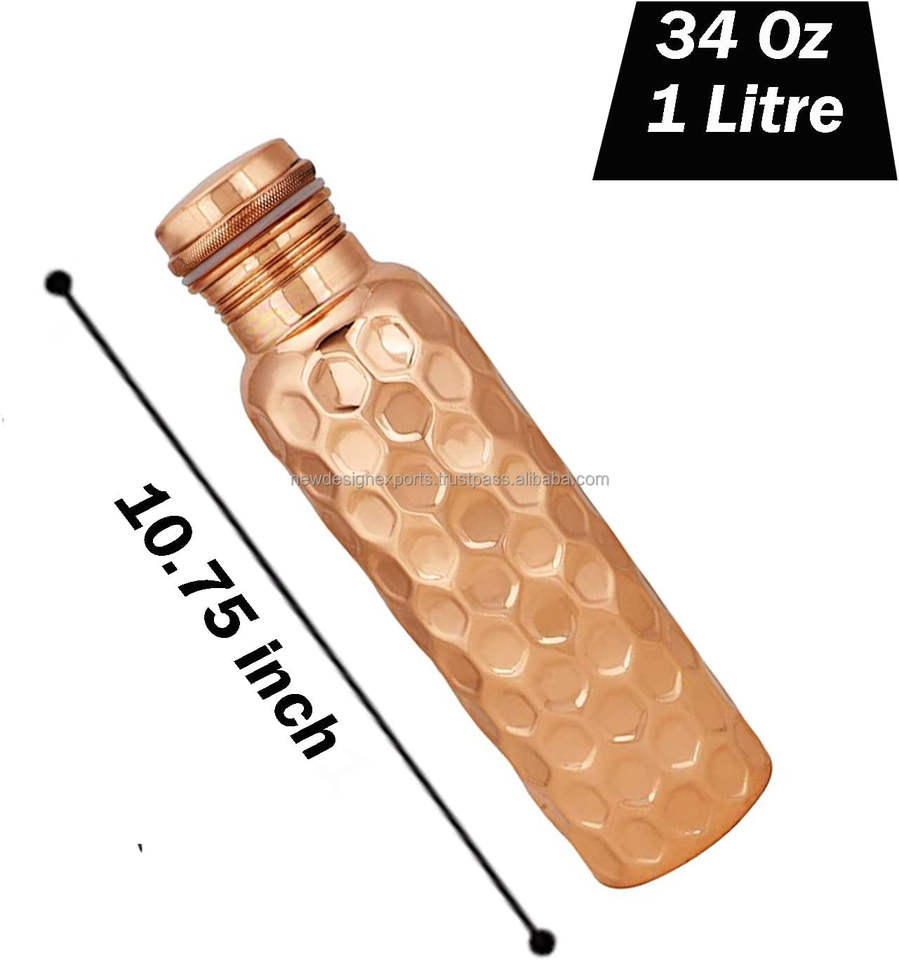 34 oz 100% Pure Ayurvedic Copper Vessel with Diamond Hammered Finish Metal Copper Drinkware Bottle Leak Proof Lid Glass Material