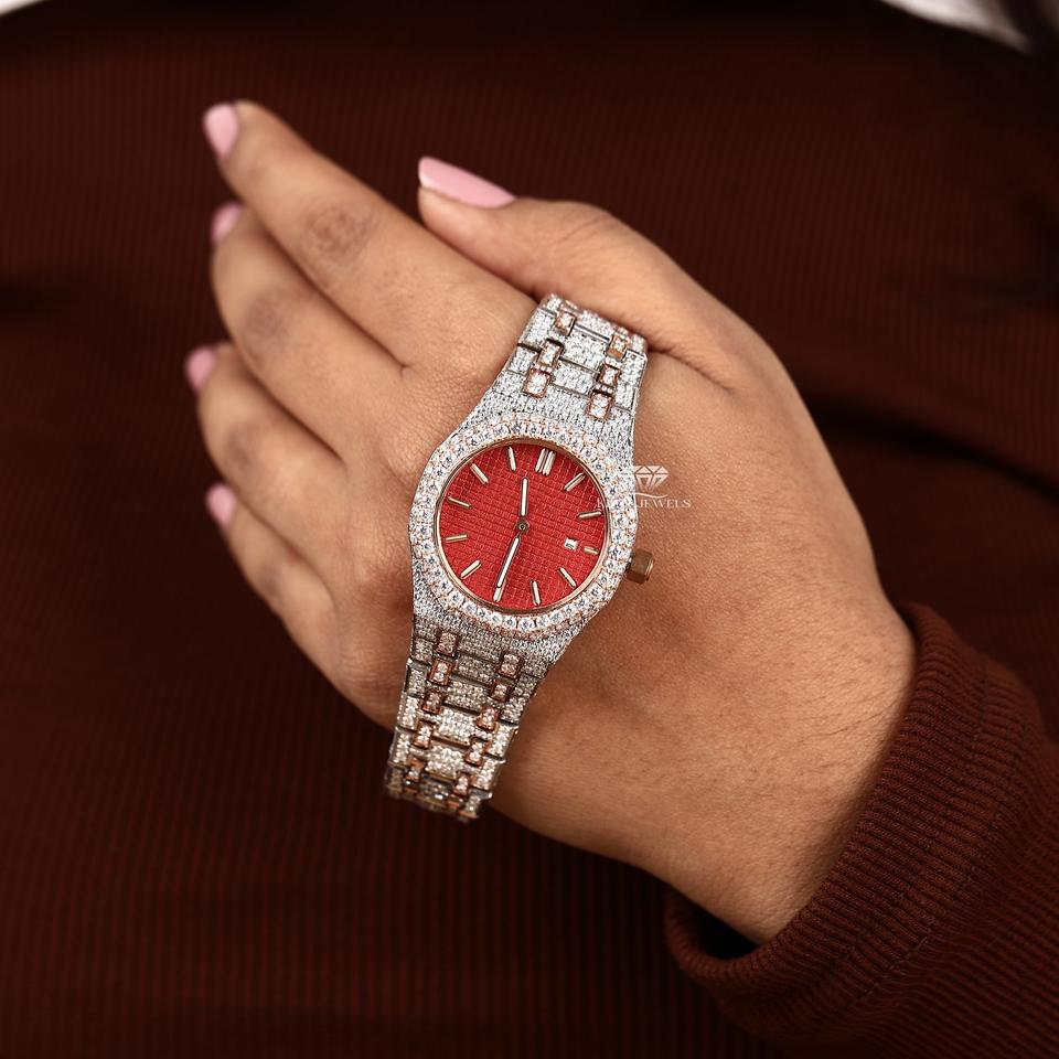 34mm Womens Moissanite Iced Out Watch Rose Gold Tone Red Stick Dial Stainless Steel Watch Hip Hop Luxury Bling WristWatchs