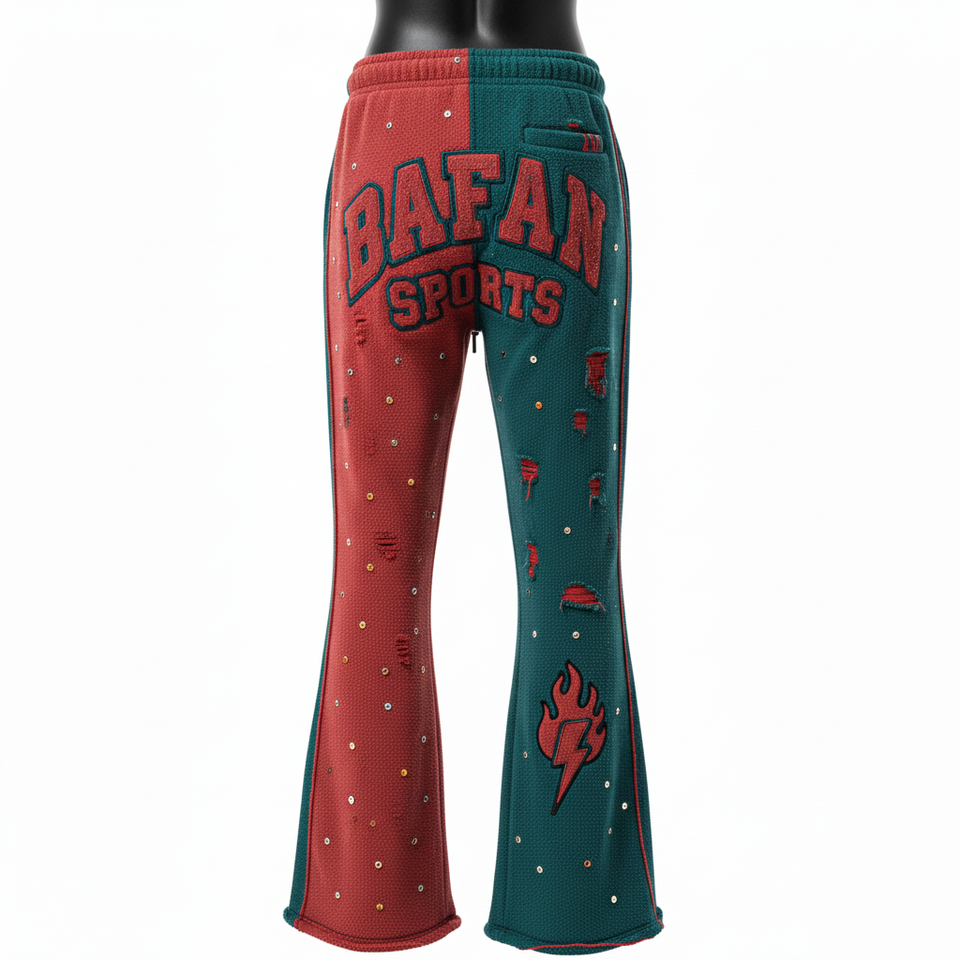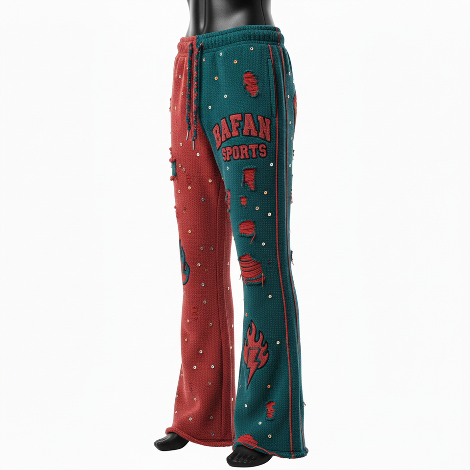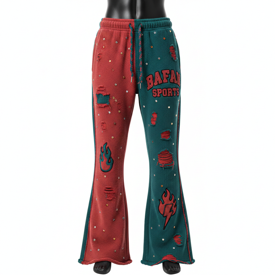 350 GSM soft breathable fabric red and green dual color panels with custom embroidery logo Washed men's pants