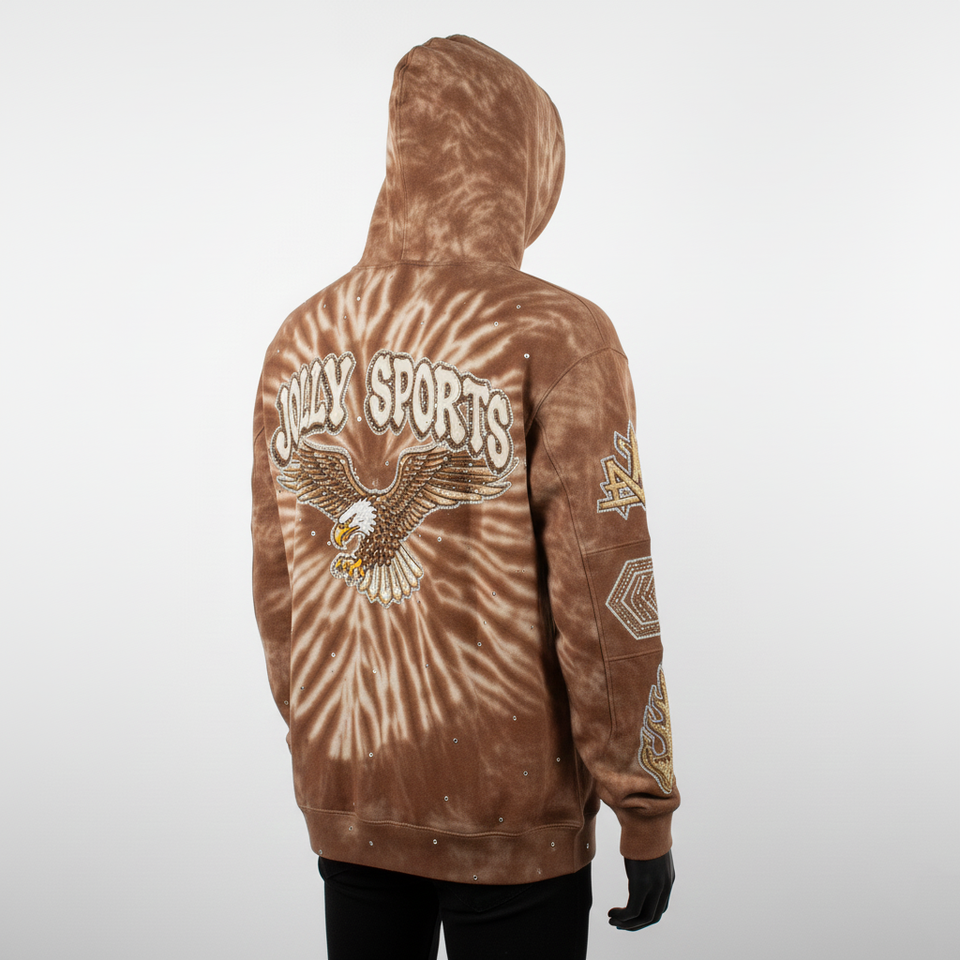 350GSM Men Cotton Tie Dye Hoodie Premium Fleece Brown Custom Embroidery Front Eagle Graphic Sleeve Panels Basics Hoodie