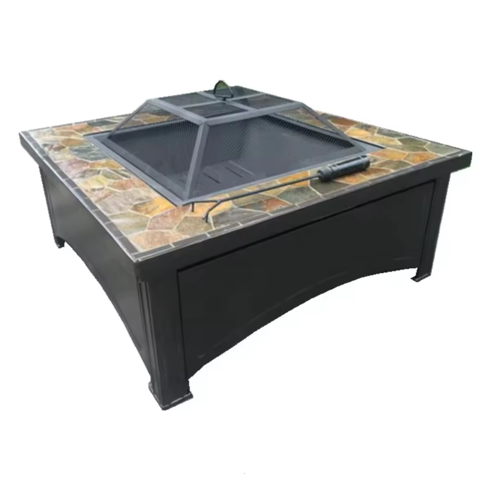 36-Inch Outdoor Square Fire Pit Table with Slate Top Steel Construction Backyard Patio Garden Wood Burning Stove Spark Screen