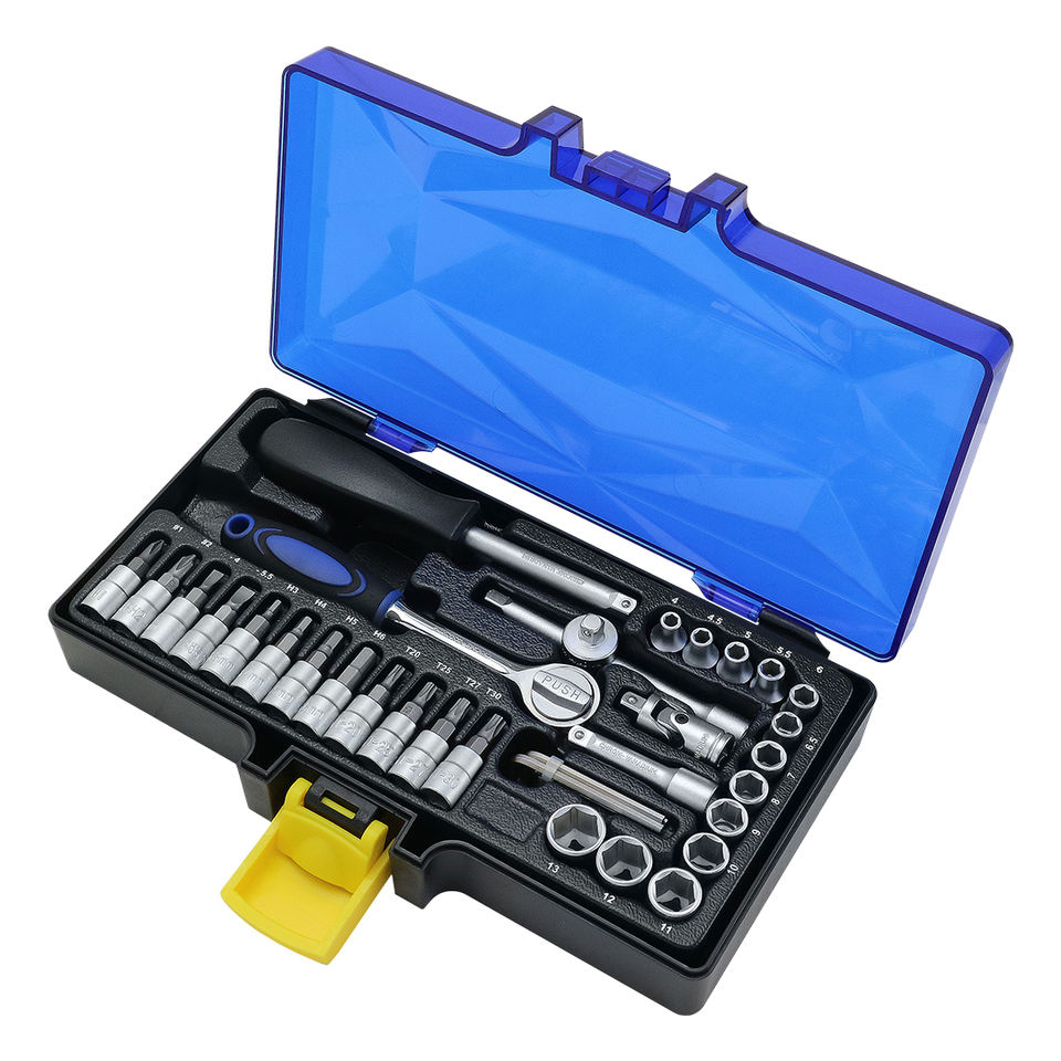extension bar, bit socket, ratchet handle, 1/4" Dr socket, universal joint, spinner handle, Hex keytool includes