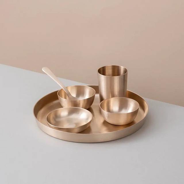 36-Piece Solid Metal Kansa Dinner Set 6 Plate (10.5\" Thali) 12 Bowls 6 Glass 6 Sweet Dish Plate & 6 Spoon Bronze Dinner Set