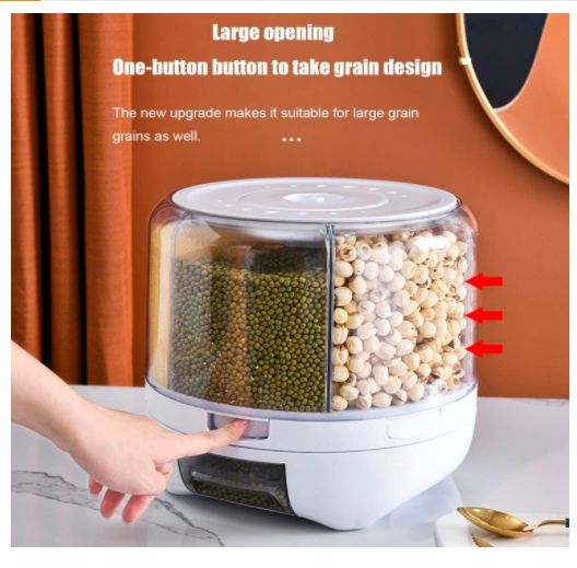 360��Rotating Rice Food Dispenser 6 Grids Rice Container Rotatable Beans Containers Storage with Sealed Lid for Peanut Barley