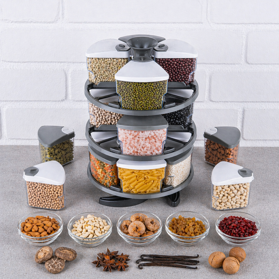 360° Rotating Spice Rack Kitchen Organizer with 12 Glass Seasoning Jars Multi-Functional Spice Storage Container Stand