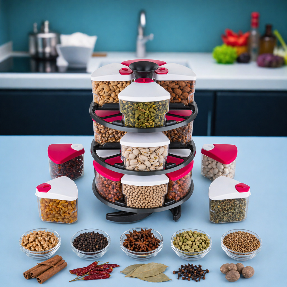 360° Rotating Spice Rack Kitchen Organizer with 12 Glass Seasoning Jars Multi-Functional Spice Storage Container Stand