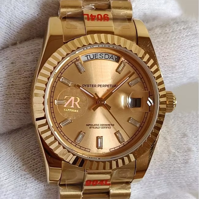 36mm Mechanical Gold Watch Hidden Clasp Luxury Vintage Hip Hop Style High Quality Sunray Dial with Baguette Hour Markers